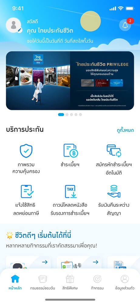 บริการวางแผนการเงินและภาษี ลูกค้าไทยประกันชีวิต สามารถวางแผนทางการเงินและภาษีได้ด้วยตนเองบนแอปพลิเคชันไทยประกันชีวิต พร้อมคำแนะนำการลดหย่อนภาษีที่เหมาะสมเฉพาะบุคคล ทำให้การจัดการด้านการเงินเป็นเรื่องง่าย และช่วยสร้างความมั่นคงทางการเงินแก่ลูกค้าในระยะยาว