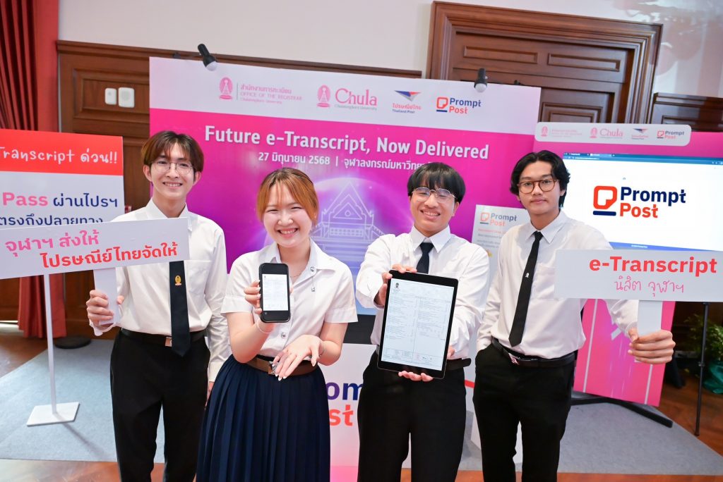 ริษัท ไปรษณีย์ไทย จำกัด ร่วมกับ จุฬาลงกรณ์มหาวิทยาลัย เปิดตัวระบบ “e-Transcript” หรือใบรับรองผลการศึกษาในรูปแบบดิจิทัลผ่านแอปพลิเคชัน Prompt Post เป็นครั้งแรกในประเทศไทย ช่วยยกระดับการจัดส่งเอกสารการศึกษาให้รวดเร็ว ปลอดภัย รองรับการใช้งานได้ทุกที่ ทุกเวลา ผ่าน Digital Postbox ส่วนบุคคล พร้อมเดินหน้าขยายผลสู่สถาบันการศึกษาทั่วประเทศ เพื่อร่วมกันวางมาตรฐานกลางของเอกสารดิจิทัลสำหรับภาคการศึกษา และต่อยอดสู่การใช้งานในองค์กรภาครัฐและเอกชนในอนาคต ทั้งนี้ บริการ e-Transcript ตั้งเป้าเริ่มให้บริการไตรมาส 3 ปีนี้