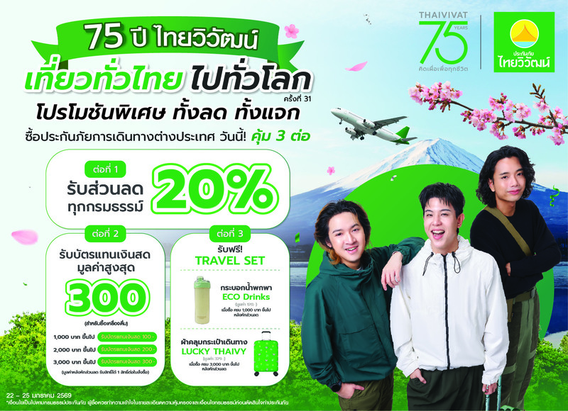 ท่ามกลางสัญญาณฟื้นตัวของอุตสาหกรรมท่องเที่ยวในช่วงต้นปี 2569 บริษัท ประกันภัยไทยวิวัฒน์ จำกัด (มหาชน) ปรับกลยุทธ์เชิงรุก เข้าร่วมงานมหกรรมท่องเที่ยว “เที่ยวทั่วไทย ไปทั่วโลก”ครั้งที่ 31 (Thai International Travel Fair 2026: TITF#31) ซึ่งจัดโดยสมาคมไทยบริการท่องเที่ยว (TTAA) ระหว่างวันที่ 22–25 มกราคม 2569 ณ ศูนย์การประชุมแห่งชาติสิริกิติ์ พร้อมเปิดแคมเปญ “คุ้ม 3 ต่อ” เพื่อกระตุ้นการตัดสินใจเดินทางและการใช้จ่ายตั้งแต่ต้นปี