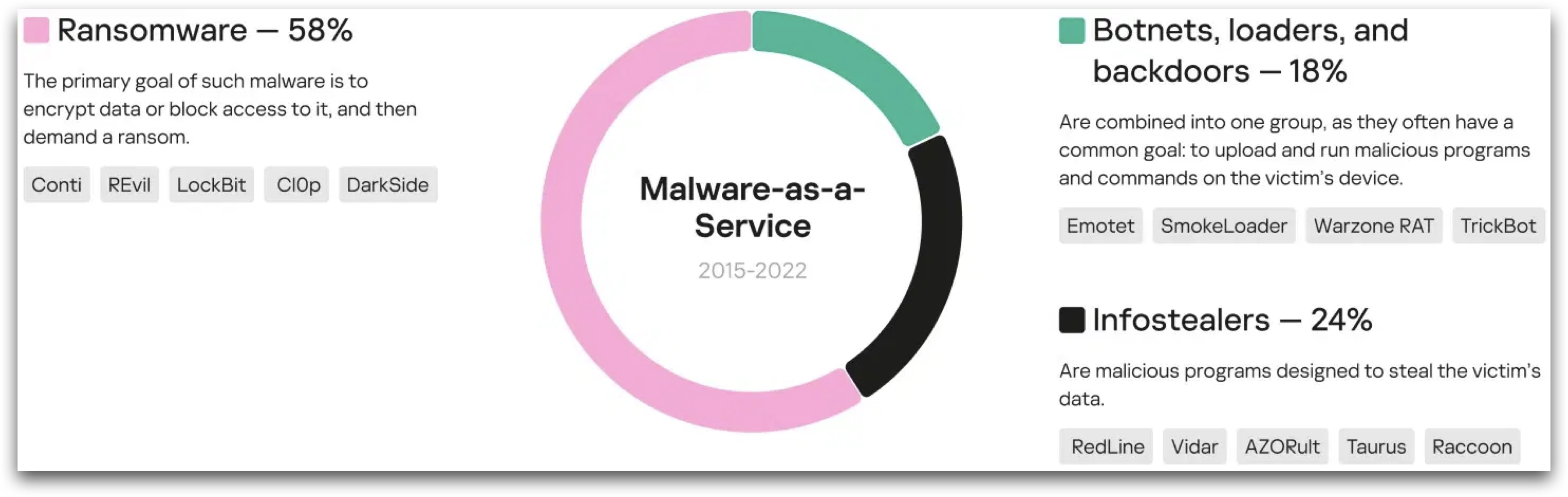 นอกจากนี้แรนซัมแวร์ยังกลายเป็นบริการในรูปแบบ Malware-as-a-Service (MaaS) ที่ได้รับความนิยมมากที่สุด ซึ่งคิดเป็น 58% ของ MaaS ทุกรูปแบบระหว่างปี 2558 ถึง 2565