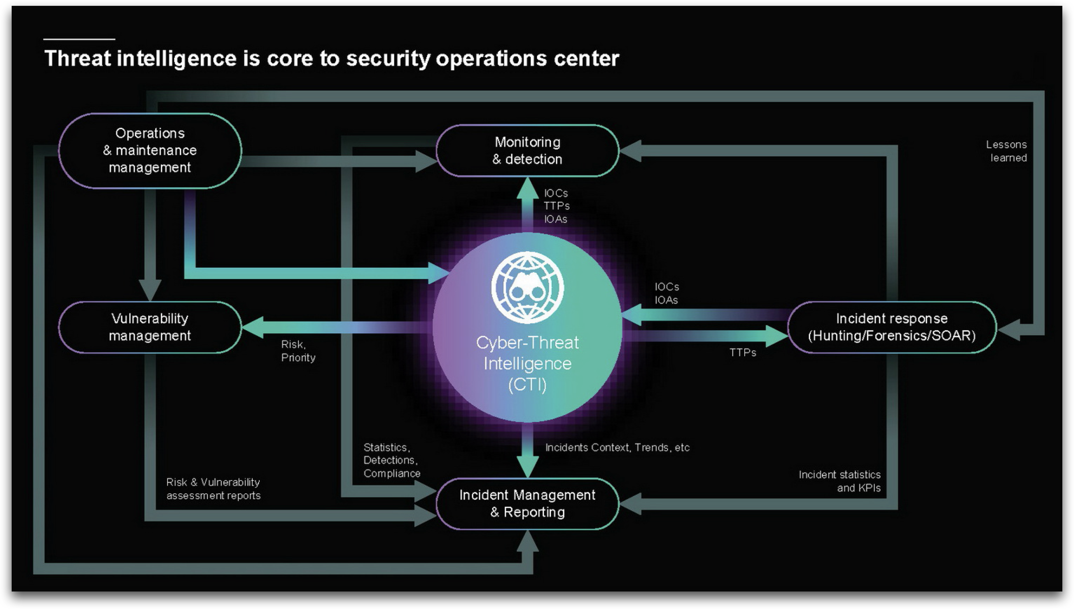 ข้อมูลภัยคุกคามเชิงลึก จะต้องเป็นองค์ความรู้ทั้งหมดที่เกี่ยวกับภัยคุกคามทางไซเบอร์และความสัมพันธ์ของภัยคุกคาม เป็นข้อมูลสำหรับศูนย์ปฏิบัติการรักษาความปลอดภัย (Security Operations Center – SOC) เพื่อป้องกันการโจมตีทางไซเบอร์ที่อาจส่งผลกระทบต่อองค์กร