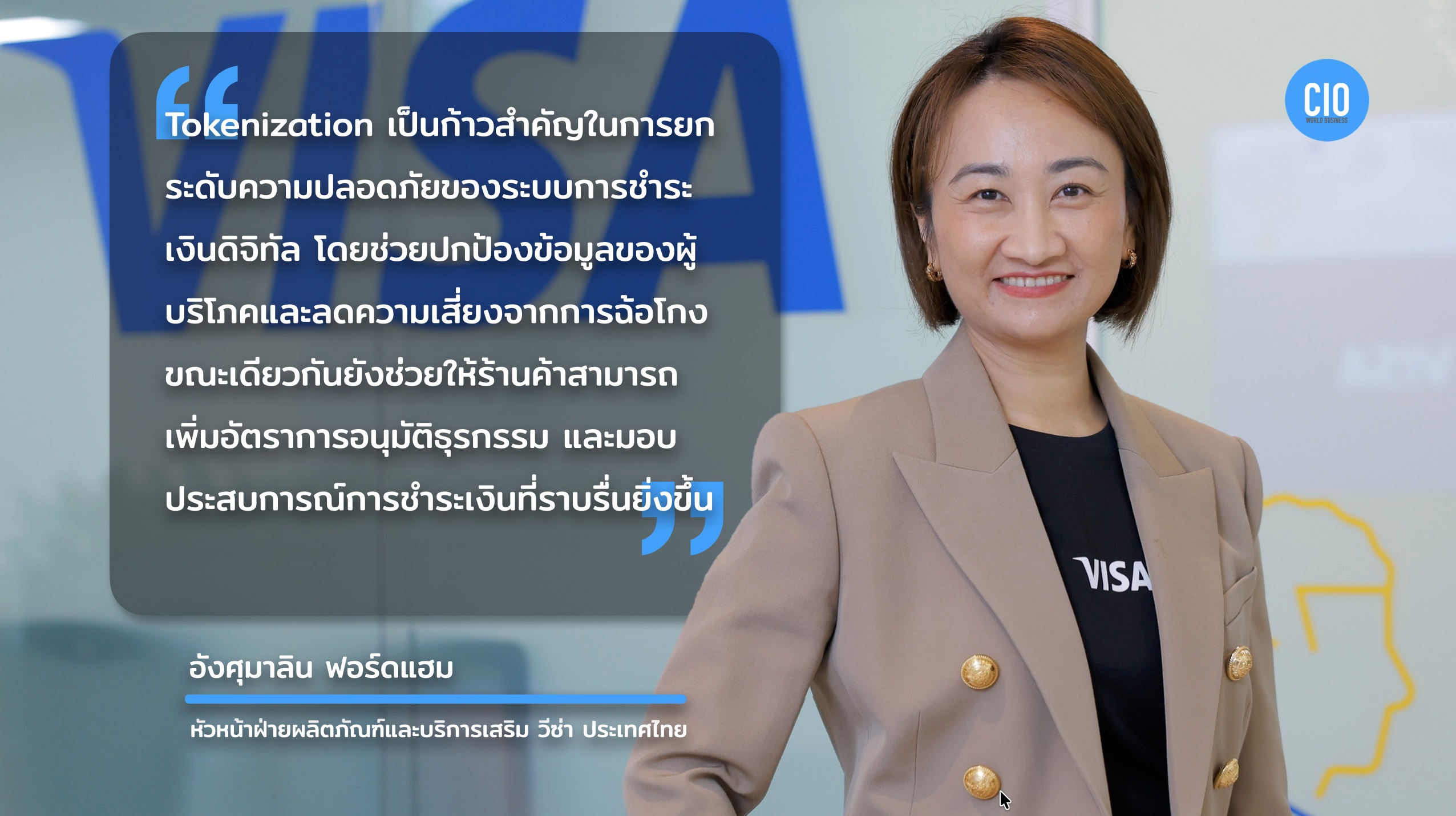 อังศุมาลิน ฟอร์ดแฮม หัวหน้าฝ่ายผลิตภัณฑ์และบริการเสริม วีซ่า ประเทศไทย กล่าวว่า เทคโนโลยี_Tokenization เป็นองค์ประกอบสำคัญของการพัฒนาระบบการชำระเงินดิจิทัลในยุคปัจจุบัน