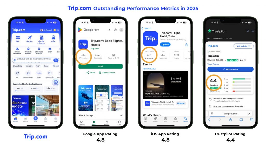 ศูนย์บริการลูกค้า Trip.com_Thailand ได้บรรลุตัวชี้วัดประสิทธิภาพที่ดีเยี่ยม โดยได้คะแนนความพึงพอใจของลูกค้าในไตรมาสที่ 1 ปี 2568 จากหลายๆ แพลตฟอร์ม ประกอบด้วย คะแนน Google App Rating อยู่ที่ 4.8, คะแนน iOS App Rating อยู่ที่ 4.8 และคะแนน Trustpilot Rating อยู่ที่ 4.4