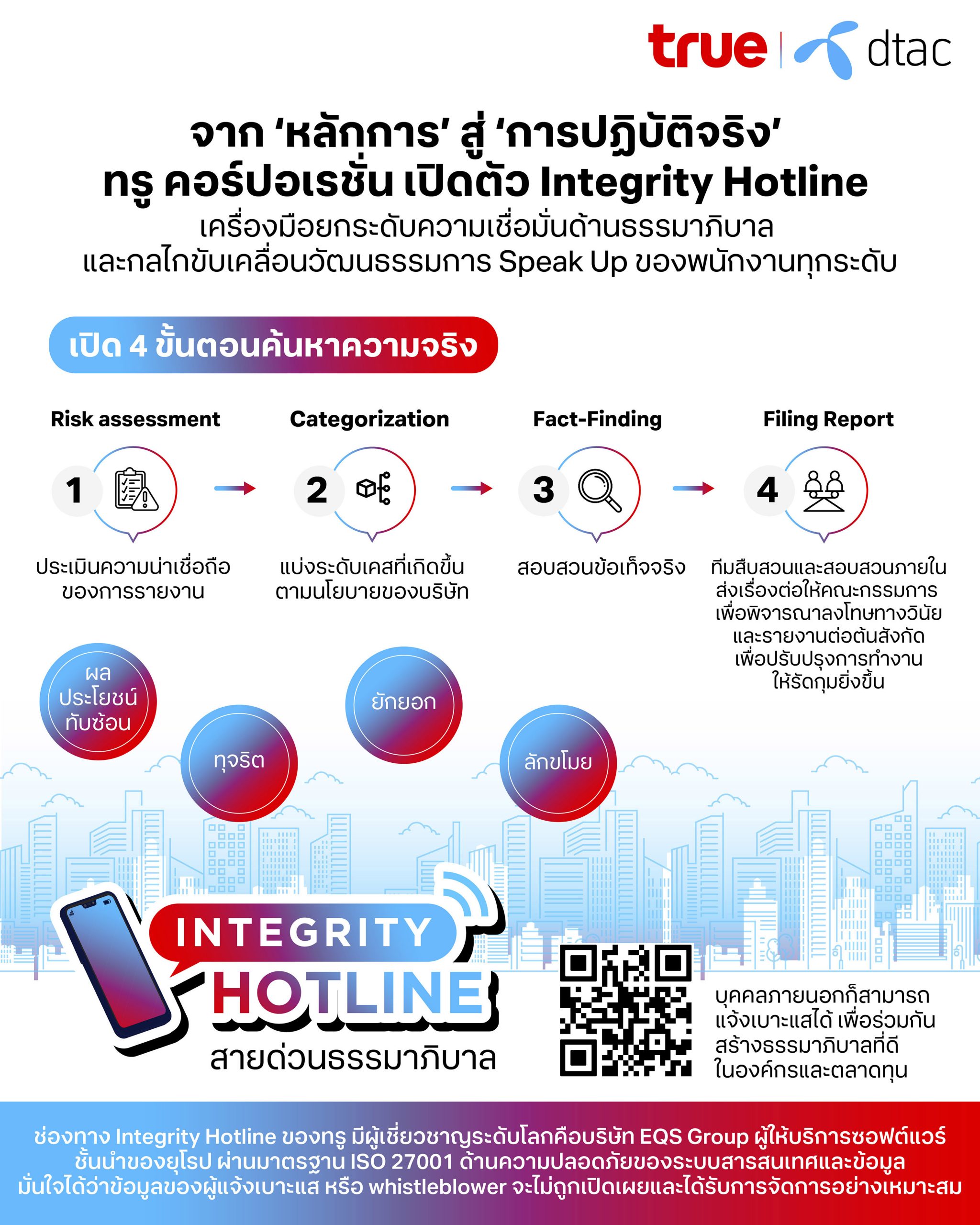 ทรูจึงได้กำหนดกรอบการทำงานที่เข้มข้น ชัดเจน เป็นอิสระสูงสุด สอดรับกับเกณฑ์ของสำนักงานคณะกรรมการกำกับหลักทรัพย์และตลาดหลักทรัพย์ และมาตรฐานระดับโลกอย่างดัชนี Dow Jones Sustainability Index (DJSI) โดยในกรณีที่มีการรายงานสถานการณ์หรือพฤติกรรมที่อาจละเมิดต่อหลักธรรมาภิบาลผ่าน Integrity Hotline ทรูจะมีการดำเนินงานใน 4 ขั้นตอนใหญ่ๆ ได้แก่