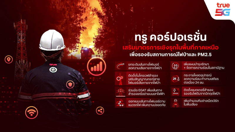 ทรู คอร์ปอเรชั่น เสริมมาตรการเชิงรุกเพิ่มประสิทธิภาพโครงข่ายพื้นที่ภาคเหนือรองรับสถานการณ์ไฟป่า และ PM 2.5 ได้แก่