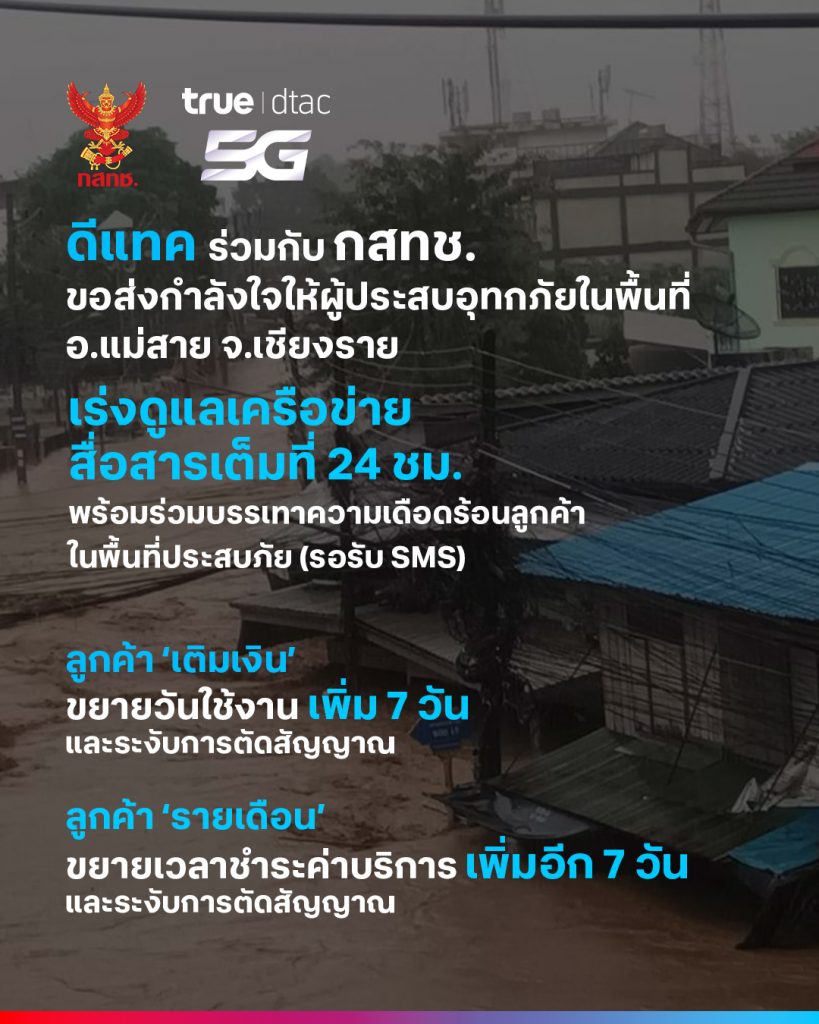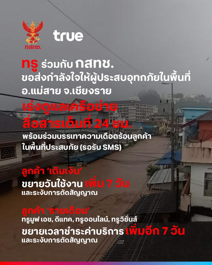 ทรู คอร์ปอเรชั่น ร่วมกับสำนักงาน กสทช. ได้ออกมาตรการเพื่อบรรเทาความเดือดร้อนแก่ลูกค้าในพื้นที่ประสบภัยน้ำท่วม จังหวัดเชียงราย (รอรับ SMS ยืนยัน) ดังนี้