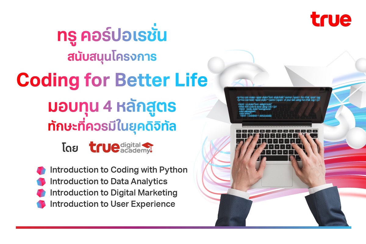 ร่วมสนับสนุนคอร์สการศึกษาผ่านหลักสูตรออนไลน์ โดย ทรู ดิจิทัล อคาเดมี เรียนฟรี ไม่เสียค่าใช้จ่าย กับ 4 หลักสูตรทักษะที่ควรมีในยุคดิจิทัล ได้แก่ 1. หลักสูตร Introduction to Coding with Python 2. หลักสูตร Introduction to Data Analytics 3. หลักสูตร Introduction to Digital Marketing และ 4. หลักสูตร Introduction to User Experience ให้เลือกเรียนตามความสนใจผ่านออนไลน์