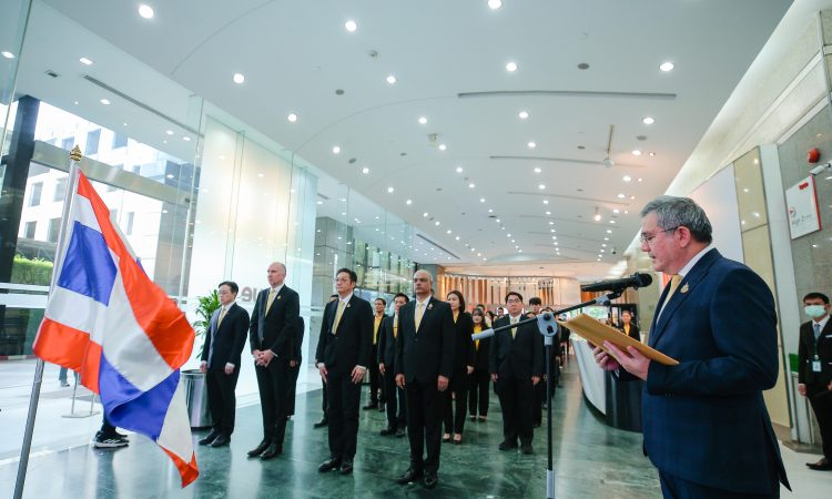 บมจ. ทรู คอร์ปอเรชั่น ร่วมจัดกิจกรรมเคารพธงชาติ เนื่องในโอกาสครบรอบ 108 ปี วันพระราชทานธงชาติไทย โดยมี จักรกฤษณ์ อุไรรัตน์ หัวหน้าคณะผู้บริหารด้านรัฐกิจสัมพันธ์ บมจ. ทรู คอร์ปอเรชั่น พร้อมด้วย มนัสส์ มานะวุฒิเวช หัวหน้าคณะผู้บริหารด้านประสบการณ์ลูกค้าและธุรกิจรีเทล ชารัด เมห์โรทรา หัวหน้าคณะผู้บริหารด้านกลุ่มธุรกิจลูกค้าบุคคล ฮากุน บริวเช็ท เชิร์ล หัวหน้าคณะผู้บริหารด้านกลยุทธ์และทรานสฟอร์มเมชั่น นิติธรรม โกวิทกูลไกร หัวหน้าสายงานด้านผลิตภัณฑ์และบริการ