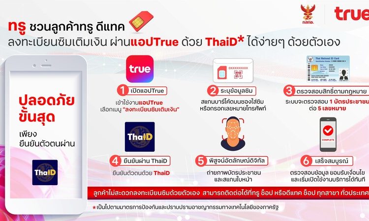 จากมาตรการป้องกันและปราบปรามอาชญากรรมทางเทคโนโลยี ของภาครัฐที่ร่วมบูรณาการพลังจากทุกภาคส่วน เพื่อยกระดับการป้องกันภัยคุกคามทางไซเบอร์ให้สามารถดำเนินการได้อย่างมีประสิทธิภาพ ทรู คอร์ปอเรชั่น พร้อมขานรับและปฏิบัติตามนโยบายอย่างเคร่งครัด เพื่อปกป้องสิทธิ์และคุ้มครองข้อมูลส่วนบุคคลสูงสุด โดยให้ตัวแทนจำหน่ายทั่วประเทศจะต้องมีการลงทะเบียนซิมด้วยเครื่องอ่านบัตรประชาชน (Smart Card Reader) และอำนวยความสะดวกให้ลูกค้าสามารถลงทะเบียนซิมเติมเงินได้ด้วยตัวเองง่ายๆ ทุกที่ ทุกเวลา ผ่านแอป True ที่จะยืนยันตัวตนด้วย ThaiD ซึ่งจะช่วยเพิ่มความปลอดภัยในการใช้งาน เป็นเกราะป้องกันภัยจากมิจฉาชีพที่แข็งแกร่ง พร้อมมอบประสบการณ์ดิจิทัลที่ใช้งานง่าย เชื่อถือได้ และมั่นใจได้เสมือนการติดต่อทำรายการด้วยตนเองที่ช็อป ลูกค้าทรู ดีแทค เริ่มใช้งานได้แล้ววันนี้