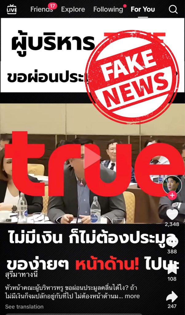 ทรู คอร์ปอเรชั่น แจ้งจับขบวนการสร้างเฟคนิวส์ มุ่งบ่อนทำลายชื่อเสียงบริษัทฯ และผู้บริหารของบริษัทฯ จากกรณีมีผู้ใช้บัญชีติ๊กต๊อก (TikTok) รายหนึ่งใช้ชื่อว่า “สุรีมาทางนี้” โพสต์คลิปวิดิโอสั้นอันเป็นข้อมูลเท็จเกี่ยวกับ ทรู คอร์ปอเรชั่น อย่างต่อเนื่อง โดยวิธีการตัดต่อข้อมูล นำมาจัดเสนอใหม่และบิดเบือนเพิ่มเติม