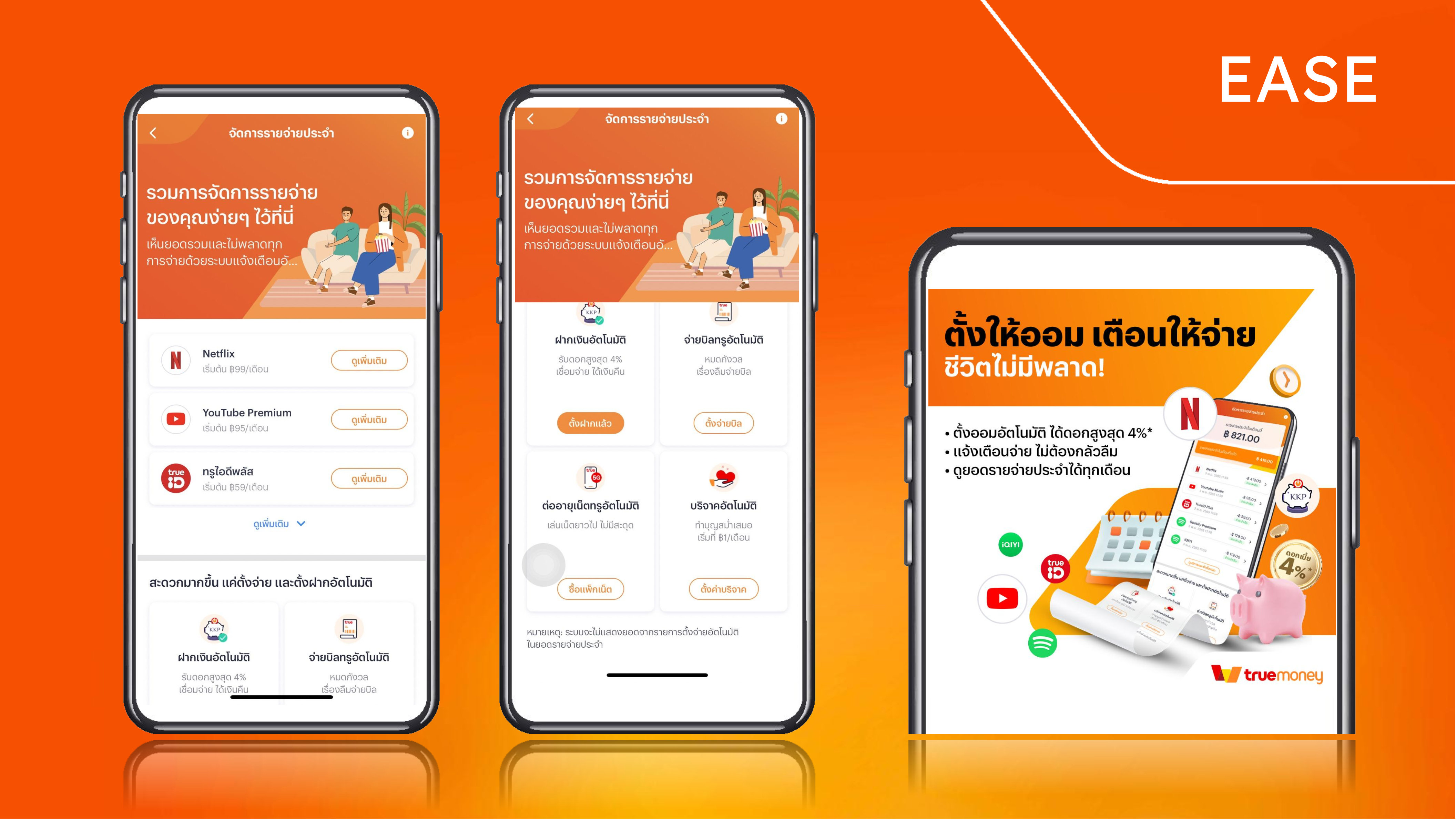 โดยในเรื่องความง่ายและการจัดการการเงิน ล่าสุด ทรูมันนี่ ได้เปิดตัวฟีเจอร์ Recurring Manager (ผู้ช่วยจัดการออมและจ่าย) ให้ผู้ใช้สามารถจัดการรายจ่ายประจำต่างๆ ได้อย่างไม่สะดุด ไม่ว่าจะเป็น ค่าสมาชิกรายเดือน บิลมือถือ หรือบริจาคเพื่อการกุศล โดยสามารถดูยอดสรุปค่าบริการ และได้รับแจ้งเตือนเมื่อถึงกำหนดจ่าย อีกทั้งยังสามารถตั้งค่าในการตัดเงินจากบัญชีทรูมันนี่ไปฝากเป็นเงินออมได้ทุกเดือน พร้อมรับดอกเบี้ยสูงสุดถึง 4%