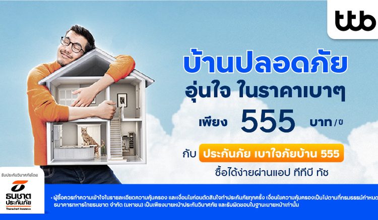 ทีเอ็มบีธนชาต หรือ ทีทีบี มุ่งยกระดับชีวิตทางการเงินของลูกค้ากลุ่มคนมีบ้านให้ดียิ่งขึ้น ตามกลยุทธ์ Home Ecosystem ที่ให้บริการครอบคลุมและเชื่อมโยงทุกด้านเกี่ยวกับเรื่องบ้าน ล่าสุด เปิดตัวผลิตภัณฑ์ “ประกันภัย เบาใจภัยบ้าน 555” เพื่อให้ลูกค้าที่เป็นเจ้าของบ้านมีแผนสำรองไว้อุ่นใจ เติมเต็มความคุ้มครองบ้านในราคาเบา ๆ ความคุ้มครองหลักแสน ด้วยเบี้ยหลักร้อย รับประกันภัยโดยบริษัท ธนชาตประกันภัย จำกัด (มหาชน) ลูกค้าซื้อได้ง่าย ๆ ด้วยตนเองผ่านแอป ทีทีบี ทัช