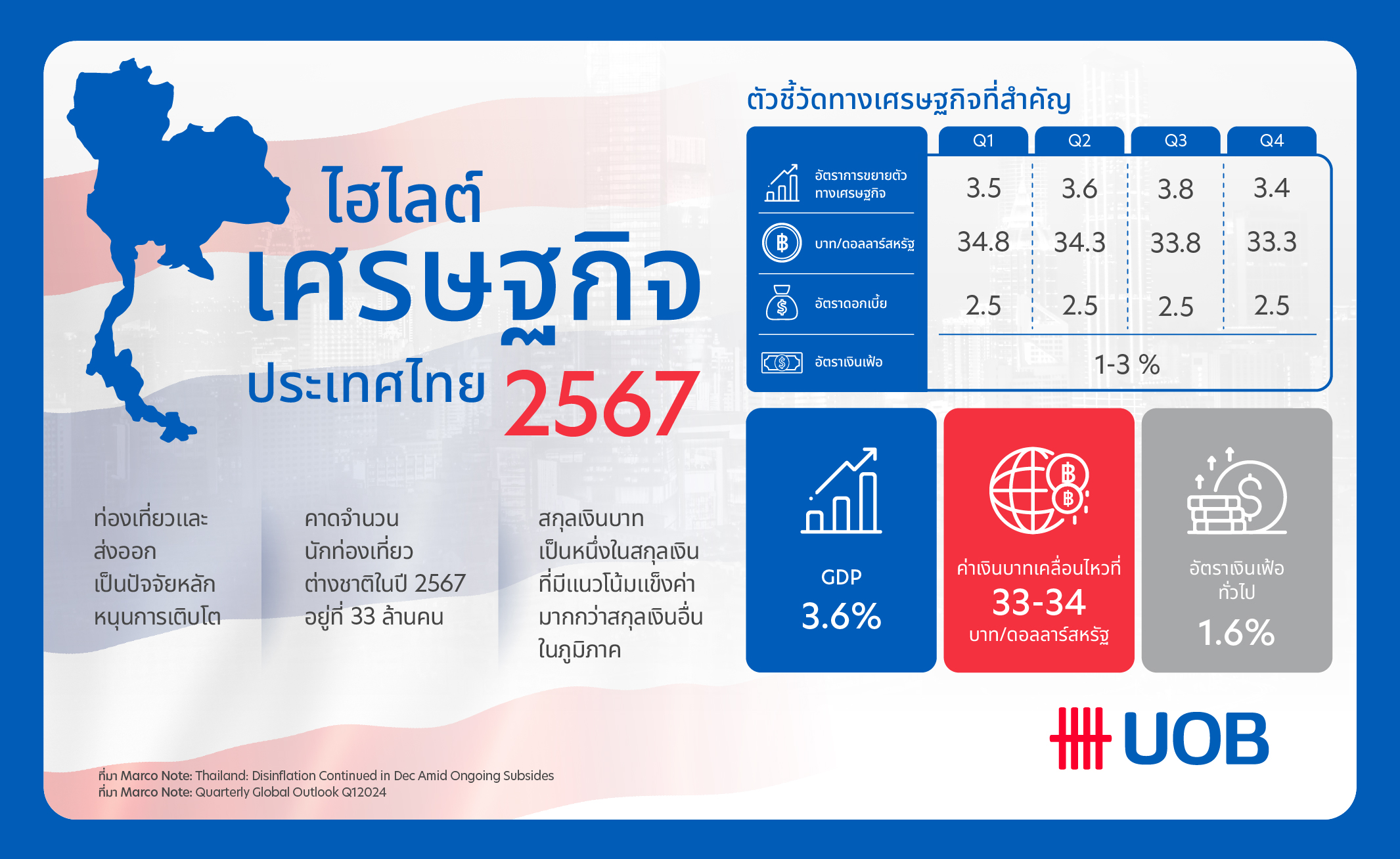 “UOB ประเมินจีดีพีไทยปี 67 ขยายตัวได้ 3.6% จากภาคส่งออก และท่องเที่ยวฟื้นตัว ดันเงินบาทแข็งแกร่ง ขณะที่แรงกดดันเงินเฟ้อแผ่วลง