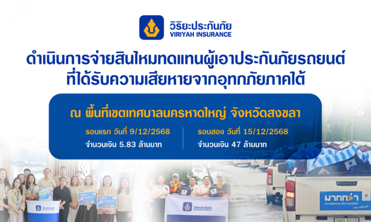วิริยะประกันภัย เดินหน้ามาตรการเยียวยาผู้ประสบอุทกภัยภาคใต้ พร้อมเร่งดำเนินการจ่ายสินไหมทดแทนผู้เอาประกันภัยรถยนต์ที่ได้รับความเสียหายจากภัยน้ำท่วม เผยรอบแรกเมื่อวันที่ 9 ธันวาคม 68 และยังคงจ่ายคืนทุนประกันต่อเนื่องกว่า 52 ล้านบาท พร้อมจัดทัพวิริยะจิตอาสาลงพื้นที่มอบถุงยังชีพช่วยบรรเทาความเดือดร้อนผู้ประสบภัยอย่างต่อเนื่อง