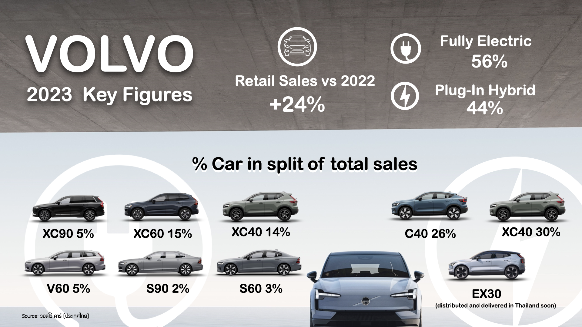 “นอกจากนี้ รถไฟฟ้ารุ่นล่าสุดที่เพิ่งเปิดตัวไปในปีที่ผ่านมาอย่าง Volvo EX30 ก็ได้รับกระแสความสนใจจากผู้บริโภคเป็นอย่างดี และคาดว่าจะช่วยกระตุ้นยอดขายรถไฟฟ้าของ วอลโว่ในปี 2024″