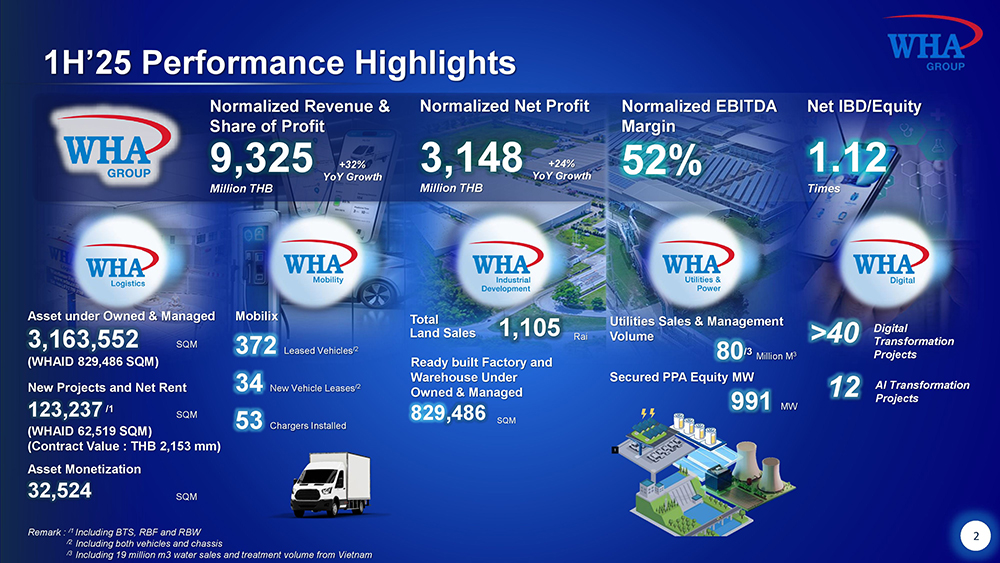 ซึ่งสอดคล้องกับฐานธุรกิจหลักของ WHA Group ที่ครอบคลุมโลจิสติกส์ นิคมอุตสาหกรรม สาธารณูปโภคและพลังงาน ดิจิทัล และโมบิลิตี้ โดยเฉพาะการเป็นผู้นำด้านนิคมอุตสาหกรรมที่ครึ่งปีแรกสามารถทำยอดขายที่ดินได้ 1,105 ไร่ และโอนกรรมสิทธิ์แล้ว 1,143 ไร่